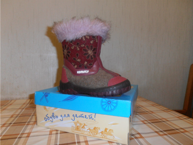 8) Валенки Котофей - 28 размер - бордовые, стелька войлок, внутри дополнительно утеплены шерстью, теплые, подошва НЕ скользит, есть светоотражающая надпись, очень теплые и красивые, голенища достаточно просторные, войдет любая ножка, в идеале, 900 руб.