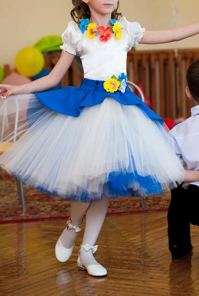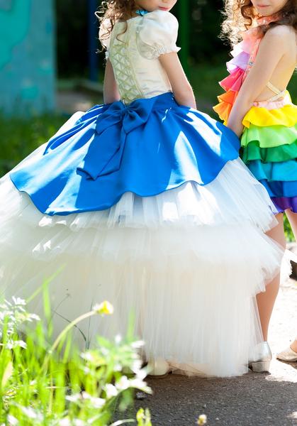 Одевали на выпускной. Шили на заказ по моему эскизу. Платье-трансформер: 2 нижних яруса юбок снимаются. Очень удобно! Дочка и в бальном длинном платье была и на самом празднике легко двигалась, танцевала, а ее подружки все в платьях путались.