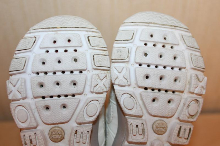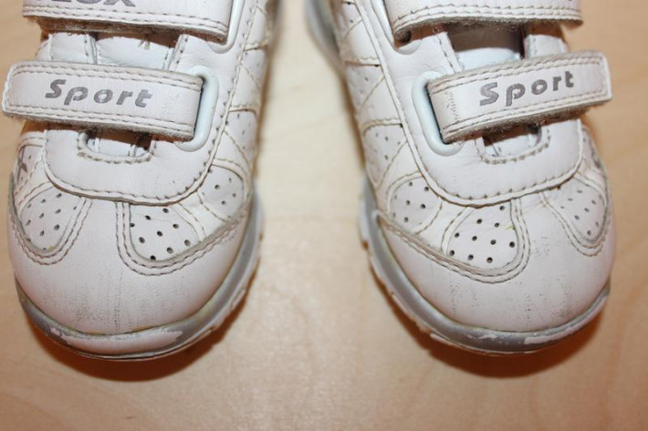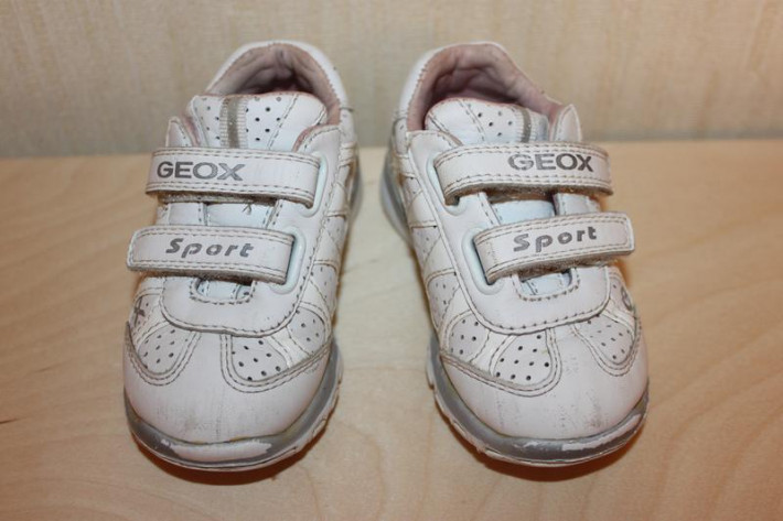 2. Дышащие кроссовки GEOX (Италия). Размер 20. Натуральная кожа. Очень легкие, удобные, ножки в них отлично дышат за счет перфорации на подошве. Носы у кроссовок потерты (на фото видно). Для лета идеальный вариант. Подойдут как мальчику, так и девочке. Длина по стельке 12,5 см. Цвет белый. Цена 500 рублей.