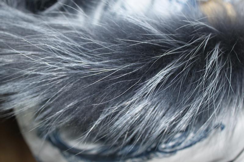 Светло-серый енот, роскошные помпоны с длинными перьями