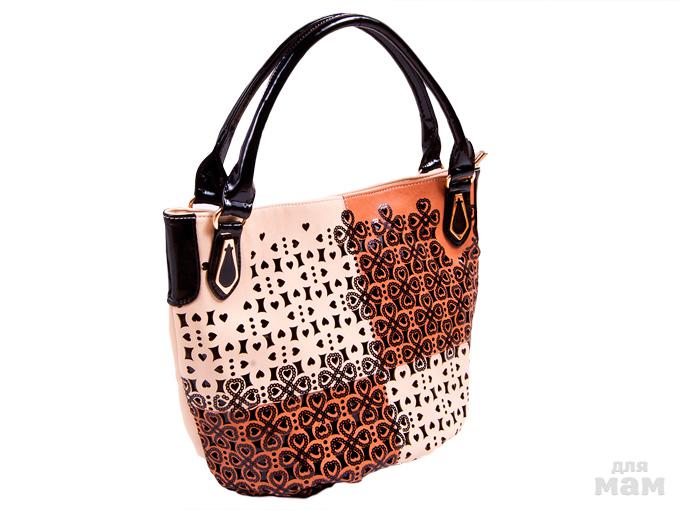 Верх: перфорированная кожа бежевого и коричневого цветов, внутри: черная лаковая. Получается очень интересный эффект! Ручка тоже лаковая. Рисунок смотрится необыкновенно красиво.
