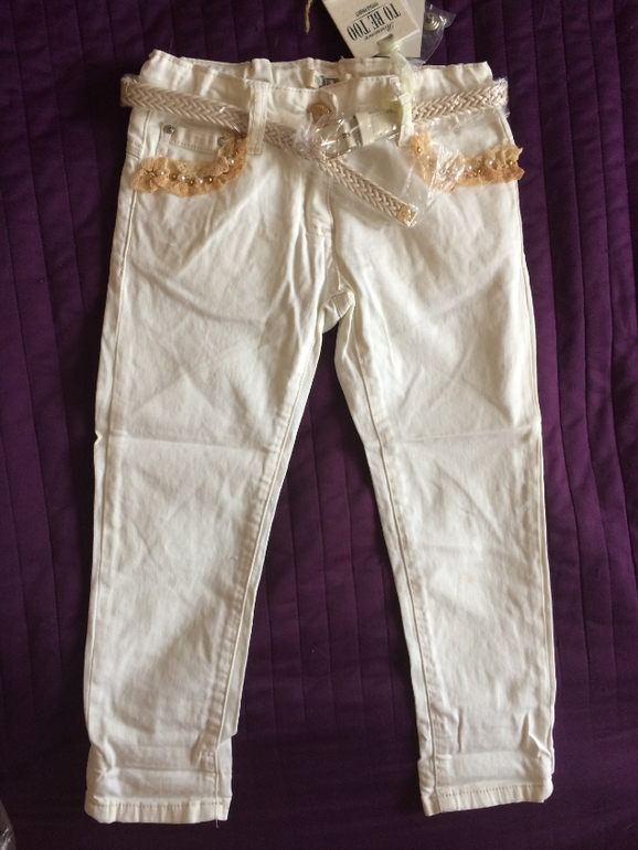 1. Джинсы To be too размер Tg 28 (5 - 6 лет, 110 - 116). Новые, с этикетками, поясом в комплекте (пояс упакован в пакет, не вскрывался). Джинсы нереальные! Цвет нежный крем, кармашки спереди сзади украшены бусинами и кружевом. Состав ткани 98% хлопок, 2% эластан. Цена 1200 рублей.Возможна отправка почтой. Возможен самовывоз: Хотьково, Россия.