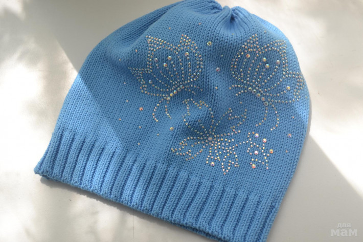 Хлопковая шапочка ярко голубого цвета с очаровательными бабочками. фото не передает блеска страз((