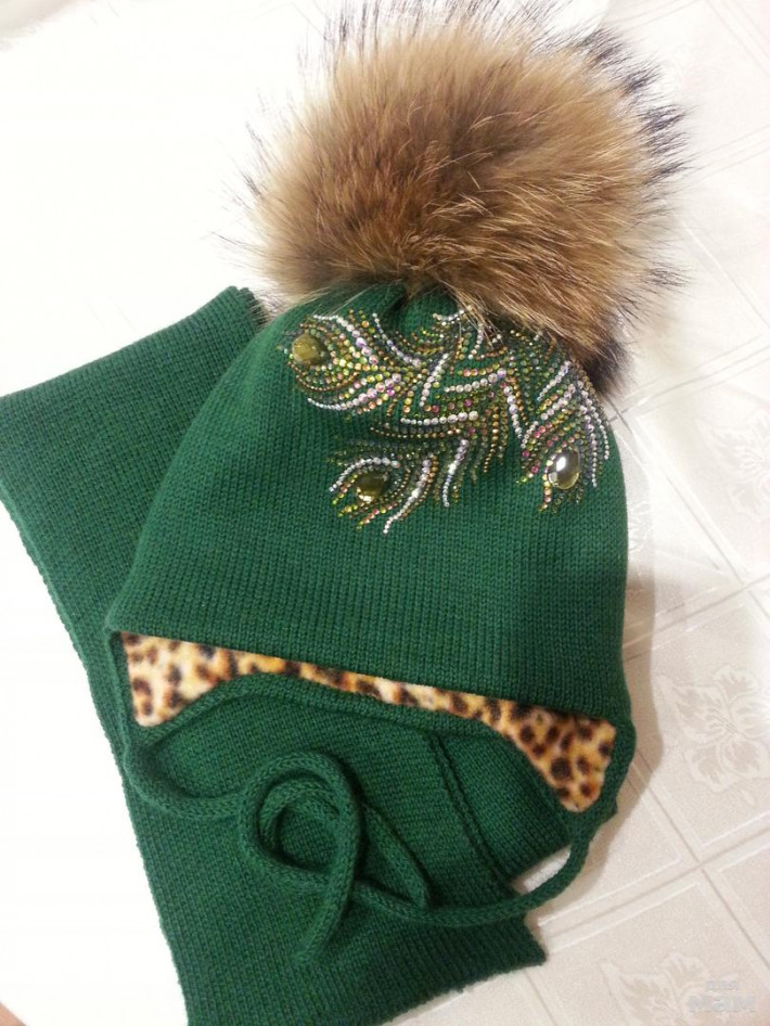 Шикарный макси-помпон (21 см по иглам) из енота натурального окраса, съемный не ленточках.