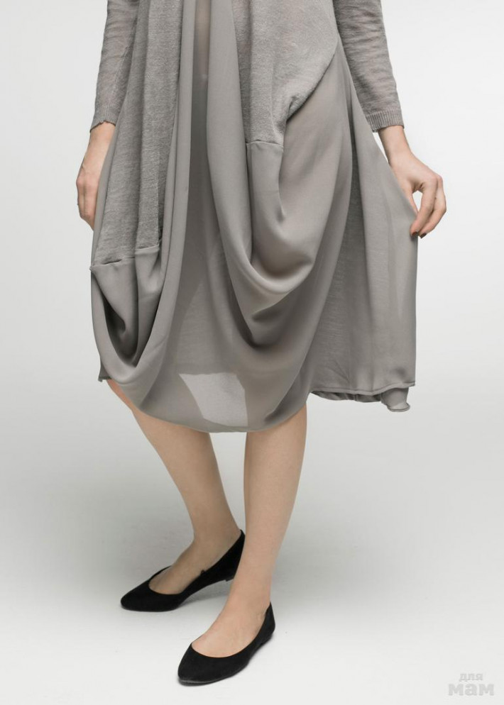 Эффектное комбинированное платье из шифона и тонкого трикотажа с драпированным мягкими крупными складками низом. Рукав втачной. Круглая горловина и низ рукавов обработаны «резинкой».