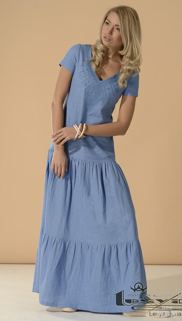 Платье полуприлегающего силуэта длинное. Рукава втачные, короткие. Горловина V-образная, с фабричной вышивкой.