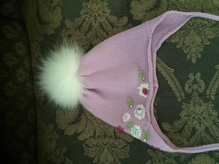 в отличном состоянии, цвет сиреневый, помпон натуральный, в один слой , меринос, не колется и не кусается