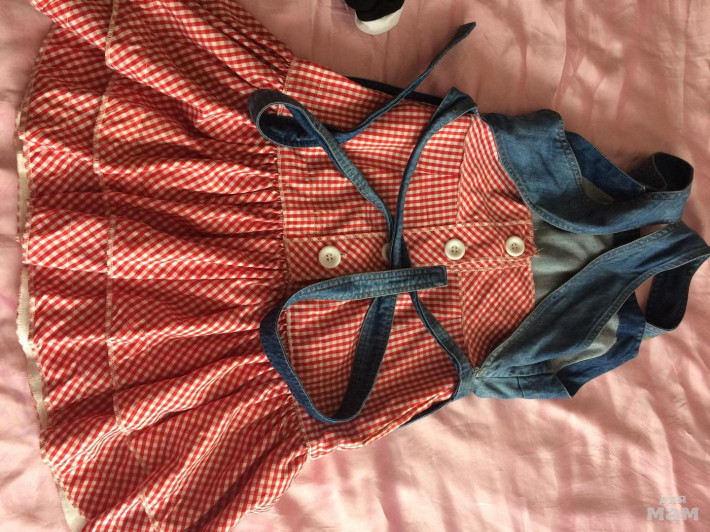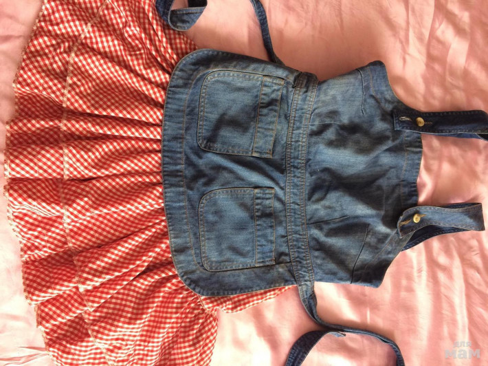 Красивое прикольный сарафан ДГоригинал , размер М Очень оригинальная модель Спереди джинсовый фартучек а сзади завязывается на бант Круто смотрится и с балетками , с кедами и туфлями Цена 2000р