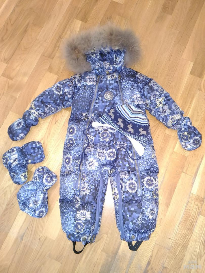 В идеальном состоянии,размер указан 86,носили с рождения,сначала как мешок,потом как полноценный комбинезон.Шапочка в подарок,до 46 ог.Штрипки силиконовые изначально потеряли,поставила резинку с перфорацией. Очень тепленький и удобный.Варежки на резинке,пинетки на кнопках в комплекте. Горлышко закрывается кнопочками.Подкладка хлопок. Все продумано до мелочей. В этом году опять купили этой фирмы комбинезон на зиму.