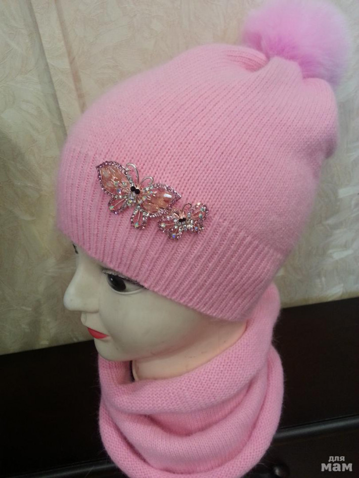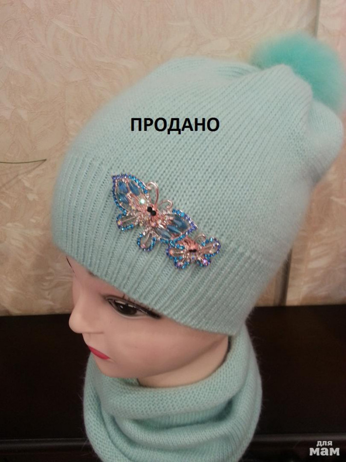 Декорированы пришивным стразовым украшением в тон шапочки и съемным помпоном из качественного искусственного кролика (выглядит как натуральный). Можно носить и без помпона...тоже очень красиво смотрится.