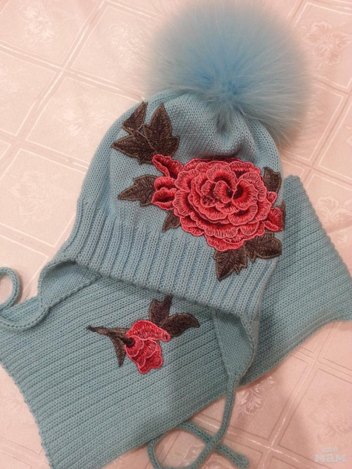 Этот комплект по декору такой же, как шапочка была в распродаже. А вот цвет немного другой. По размеру максимум 52.
