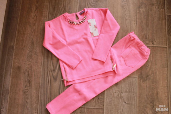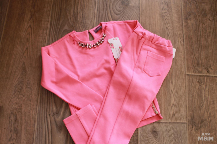 Шикарный новый костюм фирмы "Стильняшка". Брюки и Кофточка красивого розового цвета. Украшение на кофточке можно отстегнуть, на брючках есть утяжка. Размер 122. Цена как в закупке 1950 руб.