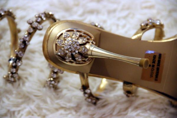 Новые босоножки золотого цвета, с инкрустацией стразами. Шикарный каблук и спираль, обертываемая вокруг ноги, делает их неповторимыми. Размер 36, длина по стельке 23-23,5 см, высота каблука 10,5 см. Куплены в США.