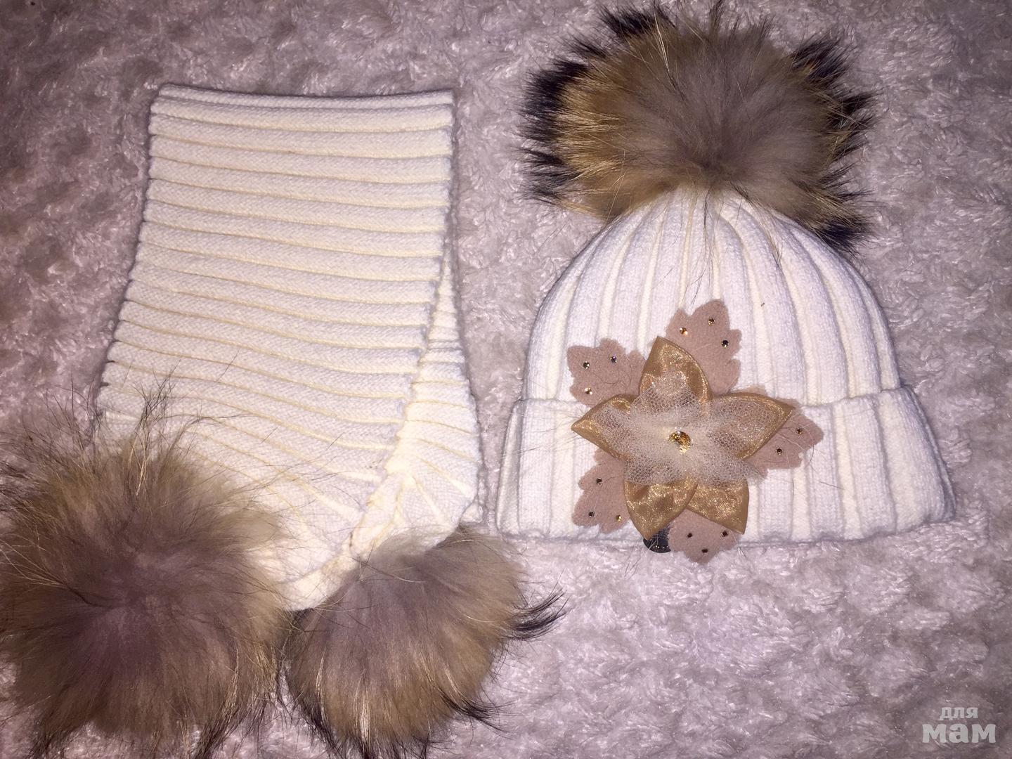 3. Комплект mokosh шапка/шарф, цвет молочный, размер универсальный 50-52-54, помпоны и украшение съёмные. Смотрится очень красиво. Сезон зима, плотная вязка, без подклада. Цена 2500р.