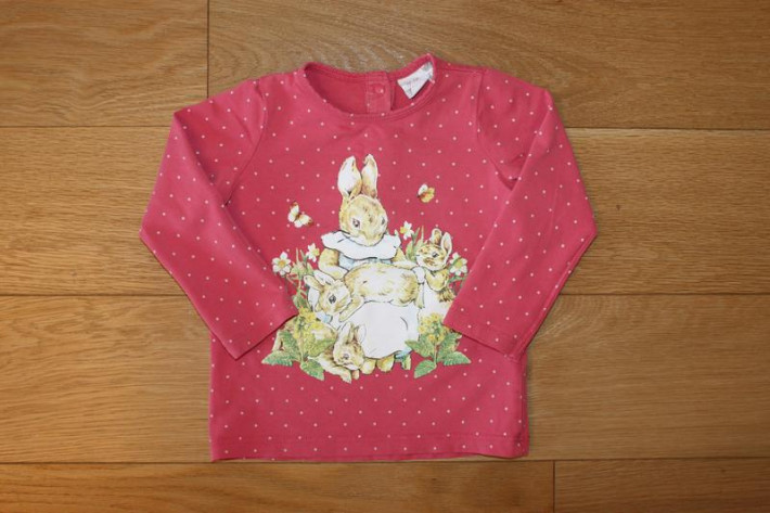 2. Футболка с длинным рукавом H&M. Размер 9-12 месяцев. Состав 100% хлопок. Цвет коралловый с кроликами. В очень хорошем состоянии. Цена 80 рублей
