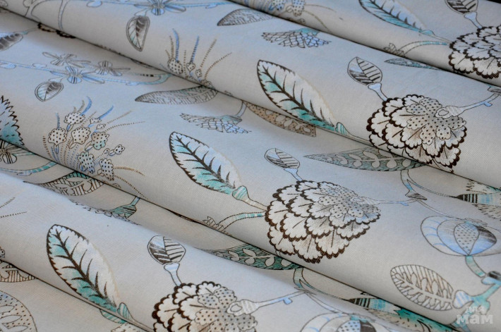 Абстрактный рисунок на серо бежевом тоне. Цвета, переходящие от светло коричневого до насыщенного, от голубого в бирюзовый. Своим незатейливым и не ярким рисунком привлекла меня эта ткань, и поверьте вам тоже она очень понравиться, в ней все сдержанно, но при этом рассмотреть хочется каждый цветок. Скатерть подойдет почти под каждый вид кухни или гостиной. Она будет уместна и на праздник и в обычный день.