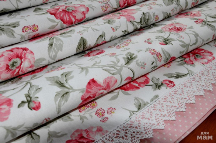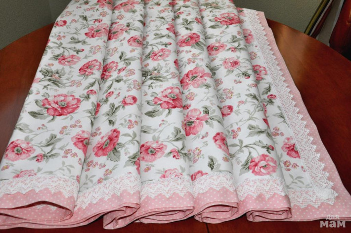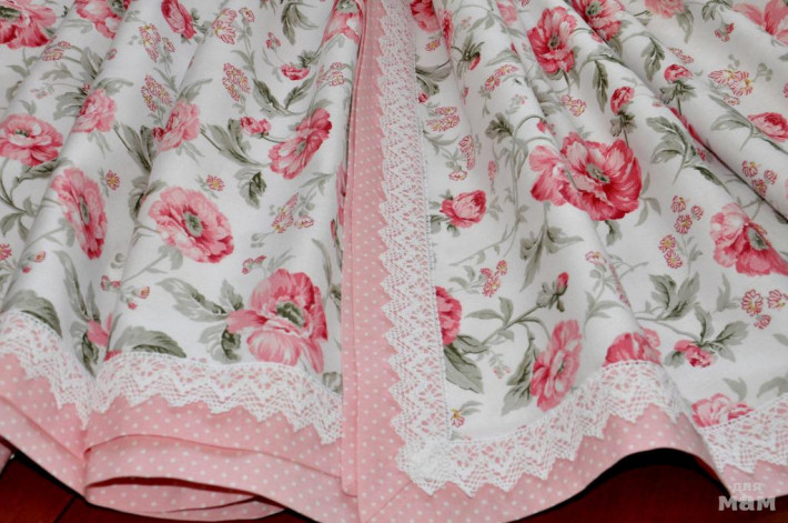Нежная, немного романтичная скатерть с цветками шиповника разных оттенков от малинового до розового и зеленью бледно - зеленого цвета переходящего в оливковый. Подымет настроение, добавит радости и уюта Вашей кухне или гостиной. Украшена скатерть нежным белым кружевом и каймой розового цвета в горошек.