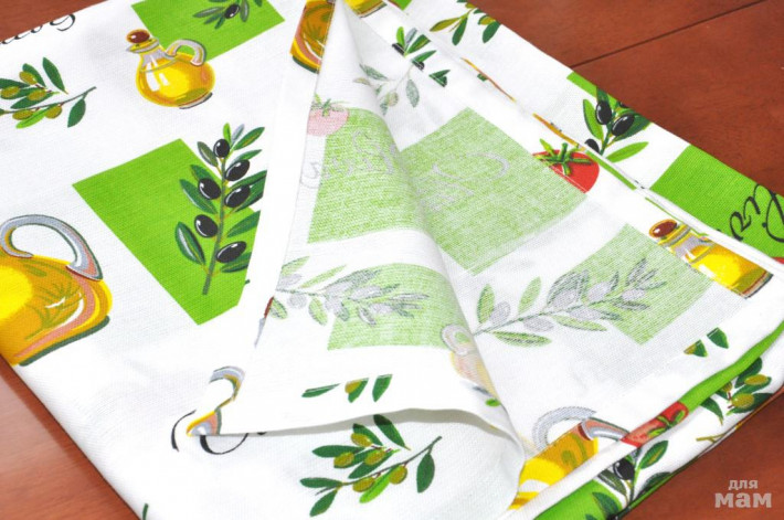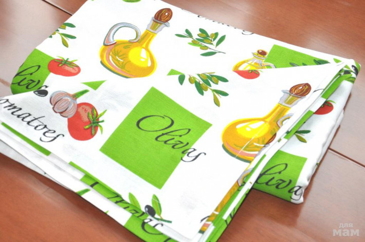 Скатерть подойдет для любой формы (прямоугольного, квадратного, круглого, овального) стола, так как ткань хорошо драпируется. Яркие краски, сочетание свежей зелени, красного - томатного, и ярко - солнечного на белой основе ткани смотрится очень аппетитно.