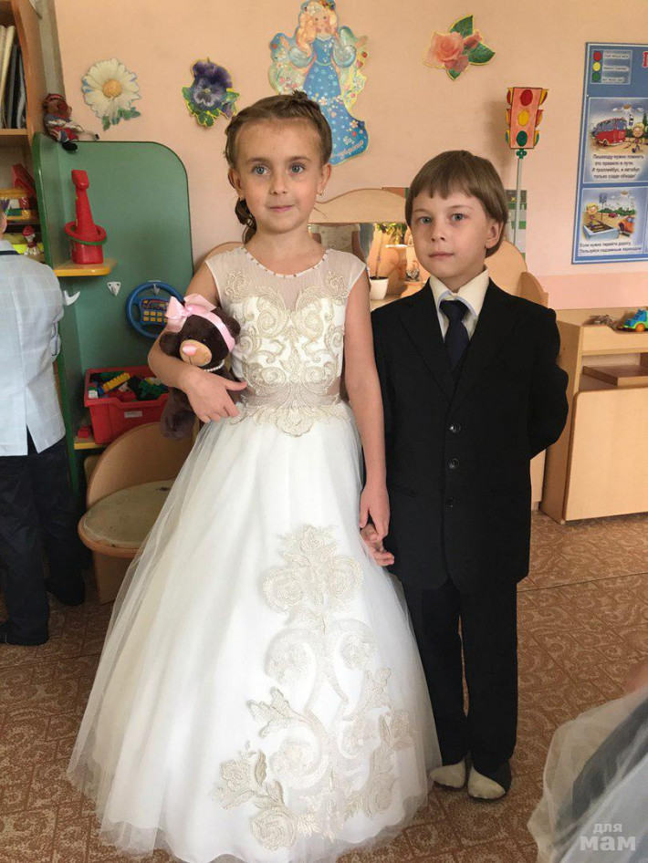 Очень красивое, нарядное платье. Покупали на выпускной в дет.сад. Одели 2 раза: на выпускной и на фотосет. Ручная вышивка, все стразики на месте. Сзади молния и шнуровка, что позволяет отрегулировать платье по фигуре.
