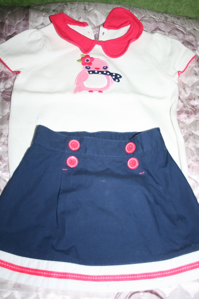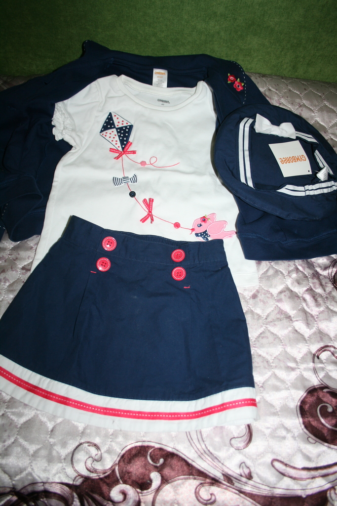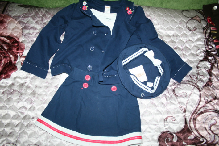 В комплект входит: пиджак, футболка, лонг, юбка, вязаная кофточка и берет.
