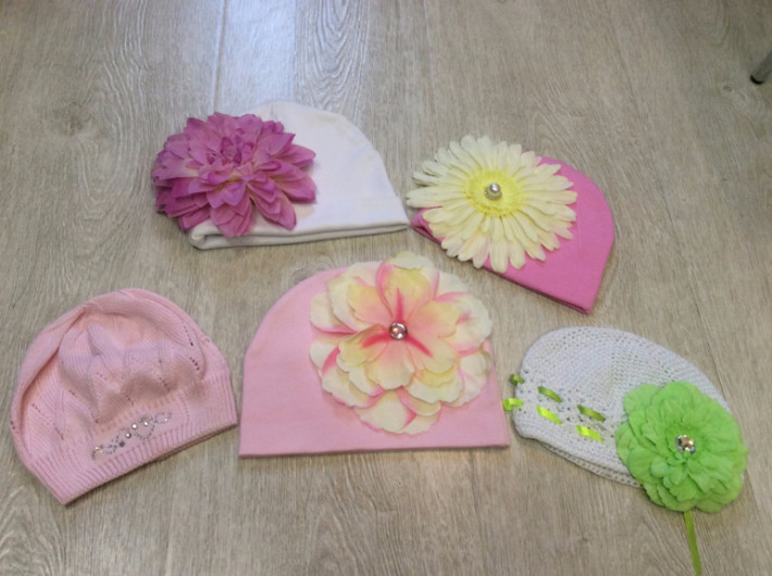 2. Шапочки с цветами: белая и розовая (р-р 50-52), в идеальном состоянии. Цветы на липучка, можно менять как нравится) по 350 руб.