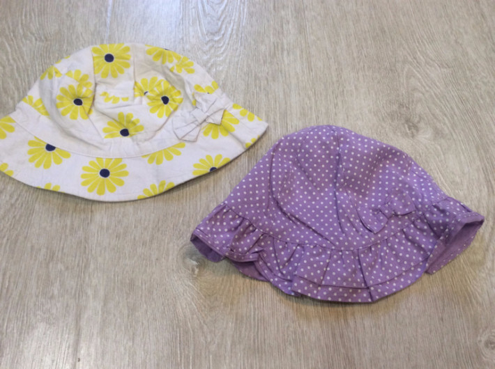 5. Панамы Sela: фиолетовая новая на 50-51, 100% хлопок; с желтыми цветами на 52 с бантиком, по 150 руб.