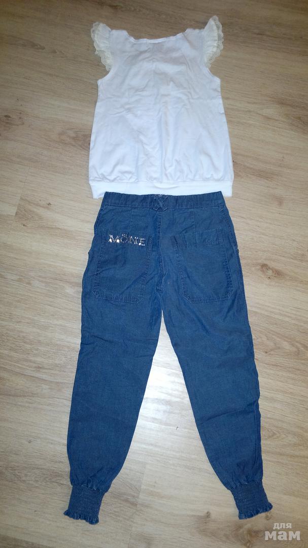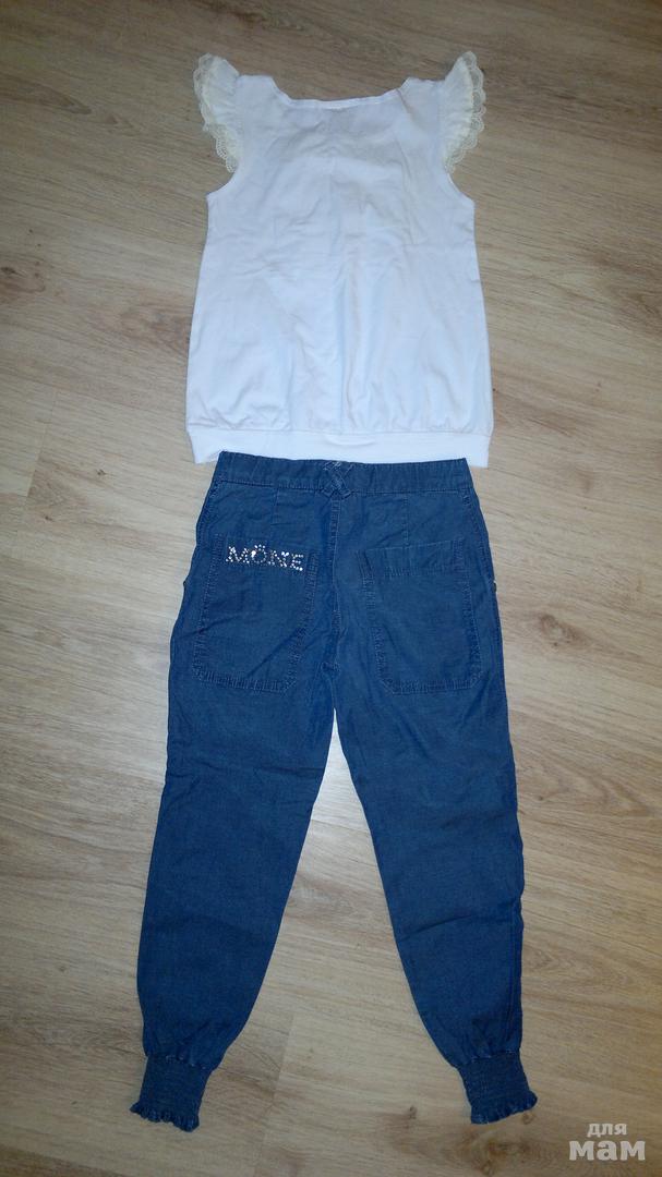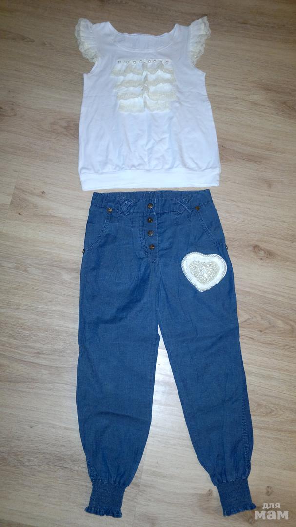 Комплект Mone 128р в идеале.Очень красивый.Футболка расшита жемчугом. Состав 95% хлопок,5% эластана.Джинсы украшены сердечком из бусин . Сзади на кармане логотип из страз. Джинс летний со стрейчем. Ткани натуральные.