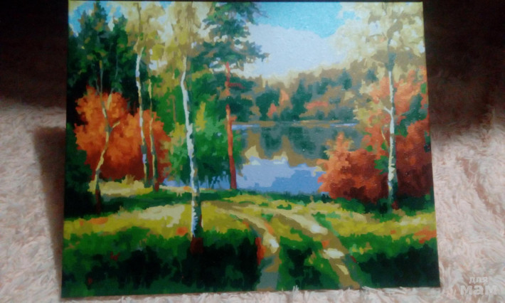 В комплект входит: холст натянутый на подрамник, 3 кисточки, акриловые краски под номерами, держатель для подвешивания на стену, лист пробник