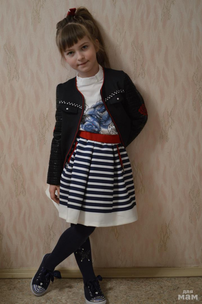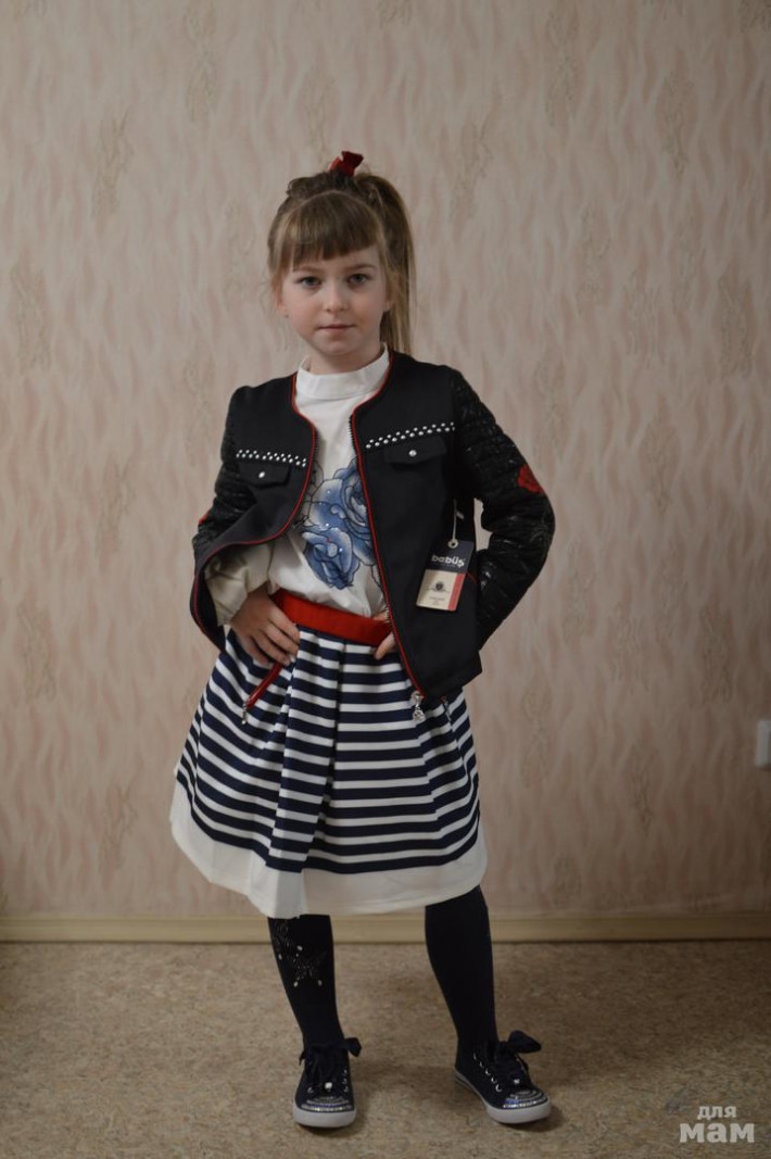 наш перехап. размер 7. на рост 120-125. курточка на хб подкладочке, блуза, юбочка пышная, с подъюбничком, комплект в больших размерах идет без колготок. цена закупки 2275, прошу за него 1500