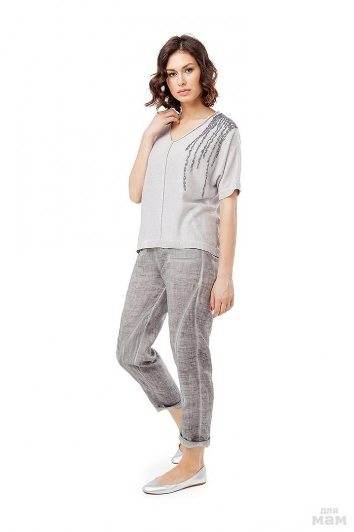 Свободные брюки с треугольными вставками на уровне голени с внутренней стороны брючин как на брюках для верховой езды. Пояс с тесьмой, настроченной поверх него, свободные края тесьмы завязываются спереди по центру.