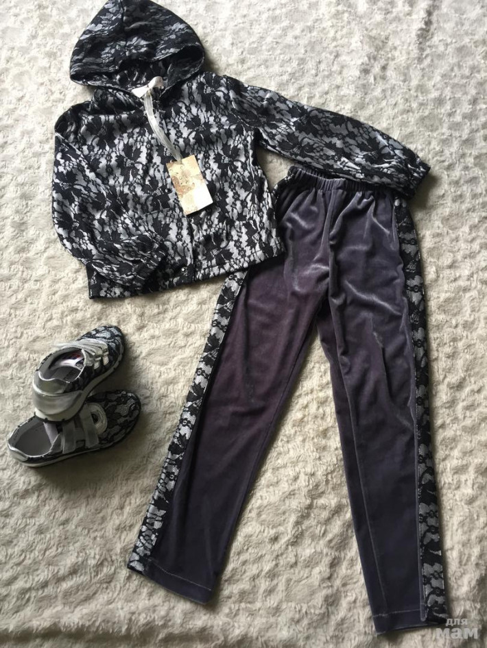 Костюм новый велюр в сочетании с кружевом, цвет серый, очень красиво сидит на ребёнке. Подходит на р.110-116см. К нему есть, идеально подходящие кроссовки минимен р.28 (2500р.)