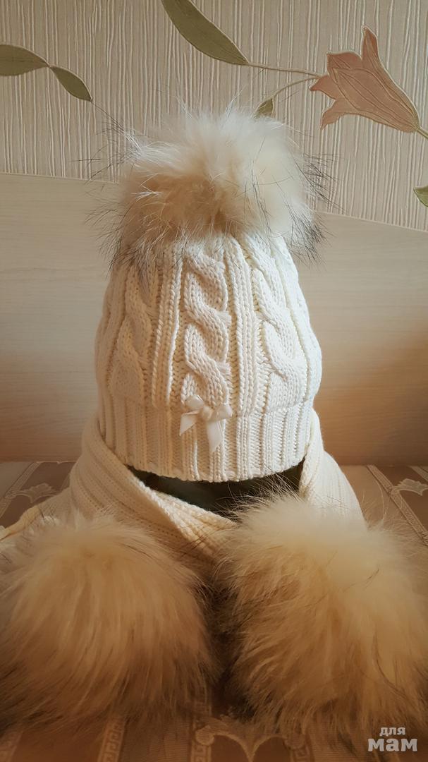 Шапка фигурной вязки с помпоном из натурального меха на завязках. Подкладка - флис.