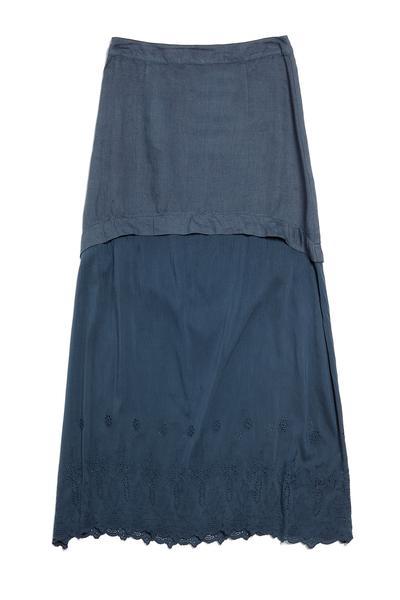 Расклешенная длинная юбка на поясе, из двух видов ткани. Нижняя часть юбки выполнена из более легкого материала, с вышивкой по низу. Состав: верхняя часть крапива 100%, нижняя 70% хлопок и 30% шёлк.