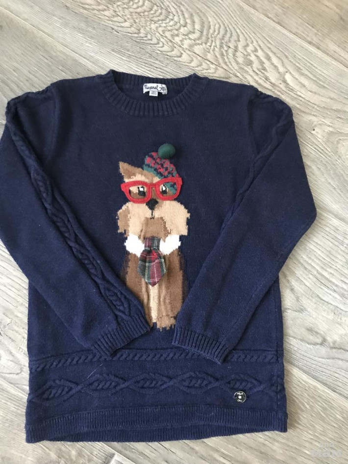 7. Тёплый свитер майорал, тёплый. Со смешным пёсиком. Бант и галстук объемные. Покупала очень дорого. Состояние очень хорошее. Размер 116-122. Цена 700 руб.