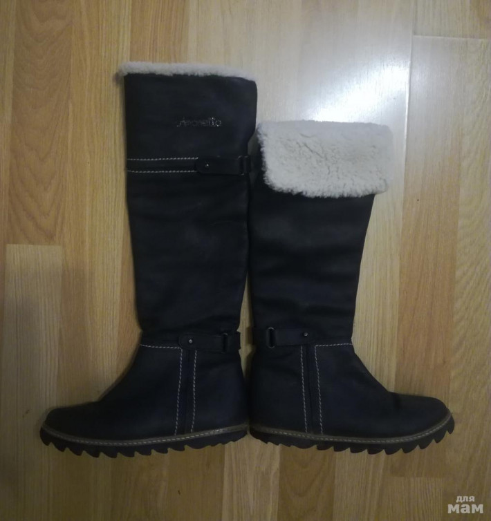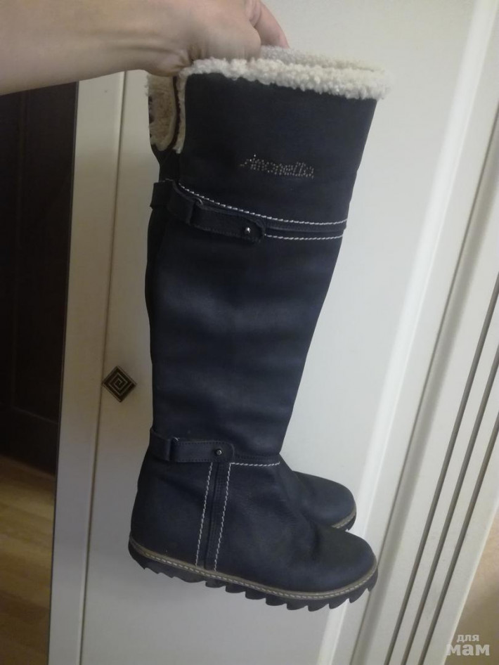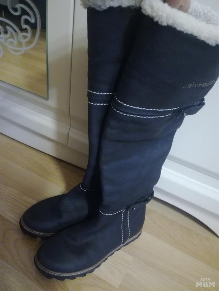 Очень крутые сапоги итальянского брэнда Simonetta. Цена этой обуви в магазине от 10000 и выше. Размер 31. Натуральная кожа(нубук), мех в вержней части, внутри кожа. Ваша принцесса в них не останется незамеченной. В развернутом состоянии как ботфорты, подружки просили мам купить такие же :)) На пухлую ножку не подойдут.Состояние хорошее. Немножко подтерта подошва сзади. Цена 1700руб+почта