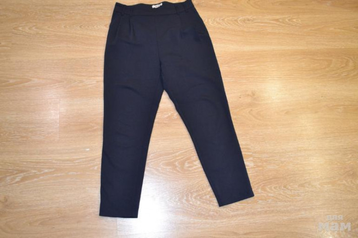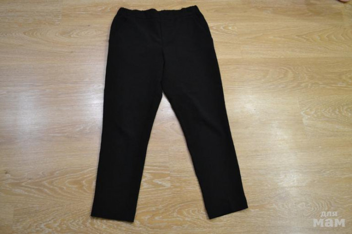 Черные брюки Оджи р.42/170(EU), на росс. 48,48-50. Они потоньше, чем первые. Классные брюки на каждый день, можно хоть с кедами носить, хоть с туфлями/ботильонами. Молнии нет, на талии резинка - одел и пошел! Нигде ничего не жмет, не давит. Их дольше носила, но состояние хорошее. Длина у них 7/8 была указана, на мой рост 165см. они см. на 4-5 выше щиколотки. 450р.