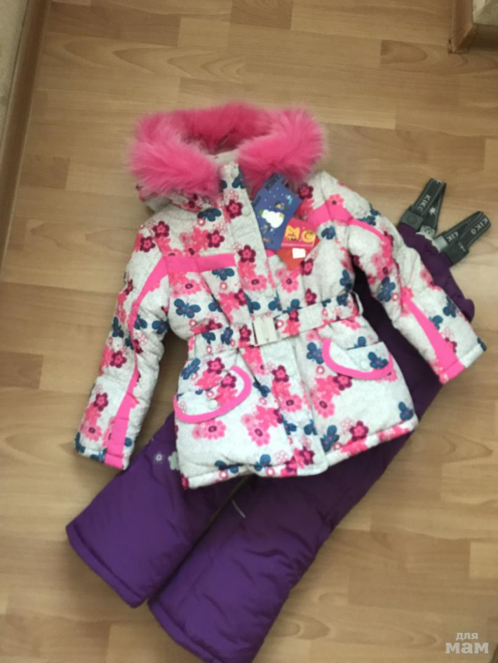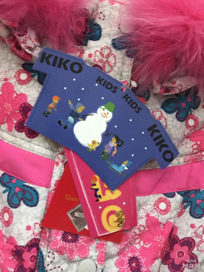Новый зимний костюм!!!! Нарядная и теплая куртка Kiko белого цвета с нежным цветочным рисунком и полукомбинезон сиреневого цвета. Бабочка и полоски на штанах - светоотражатели. Рукава куртки с отворотом для регулировки длины и с трикотажными манжетами изнутри, сохраняющими тепло. По низу куртки изнутри регулирующая кулиска. Длина брюк регулируется отворотом, изнутри брюк на подкладке находится резинка, которая одевается на обувь, для сохранения тепла и предотвращения попадания снега внутрь.