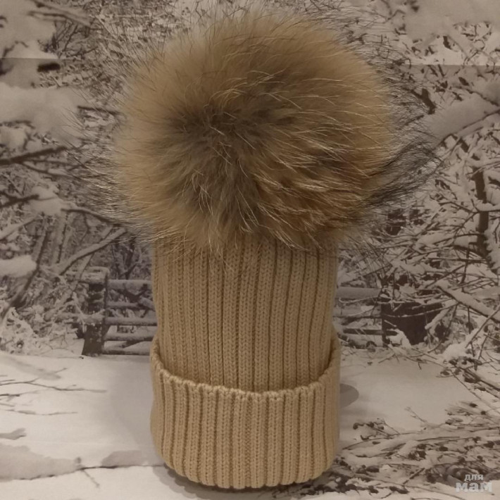 Все шапочки связаны из 100% итальнского мериноса и укомплектованы большими помпонами из енота в тон.