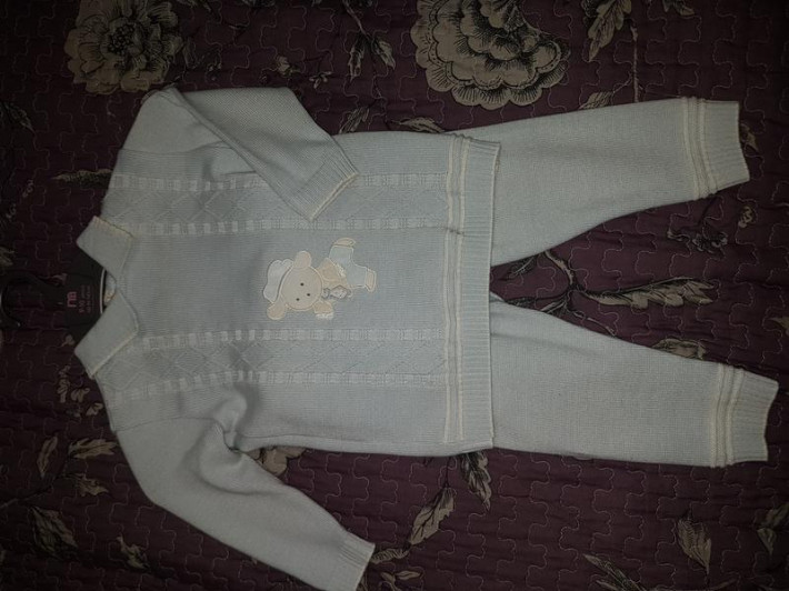 Комлект для мальчика размер 80. Бу один раз. Застегивается на пуговицы по всей длинне, одевать очень легко. Отличный состав, не жаркий. На прохладное лето и теплую осень, ну или в гости)))