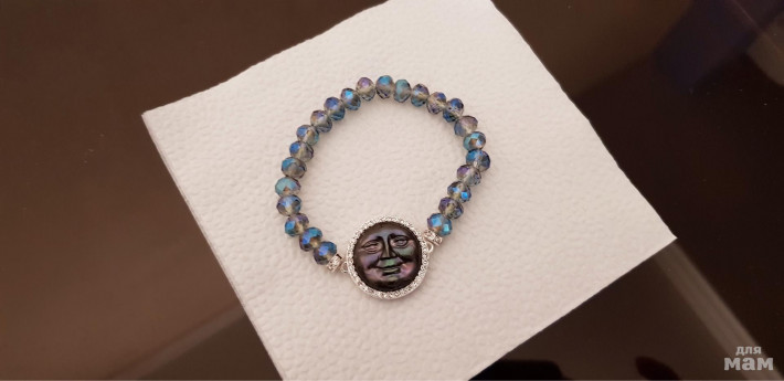 Все луны произведены вручную из опалового стекла, техника запатентована. Это очень кропотливый и долгий процесс. Таких лун не производит более никто! Бусины выполнены из гранёного разноцветного стекла. Луна в окружении белых страз. На солнце и при искусственном освещении переливаются (и луна, и все стразы/бусины) разными оттенками. Лунный лик вообще завораживает. Взгляды окружающих точно будут прикованы к вашей руке в таком необычном браслете. На луне стоит фирменной клеймо и надпись CHINA, поскольку там закупается фурнитура для браслетов. Браслет не ношен. Привезен на зказ из Америки. Цена 5000. На фото, конечно, не отразилась игра и переливы волшебного лунного лика.