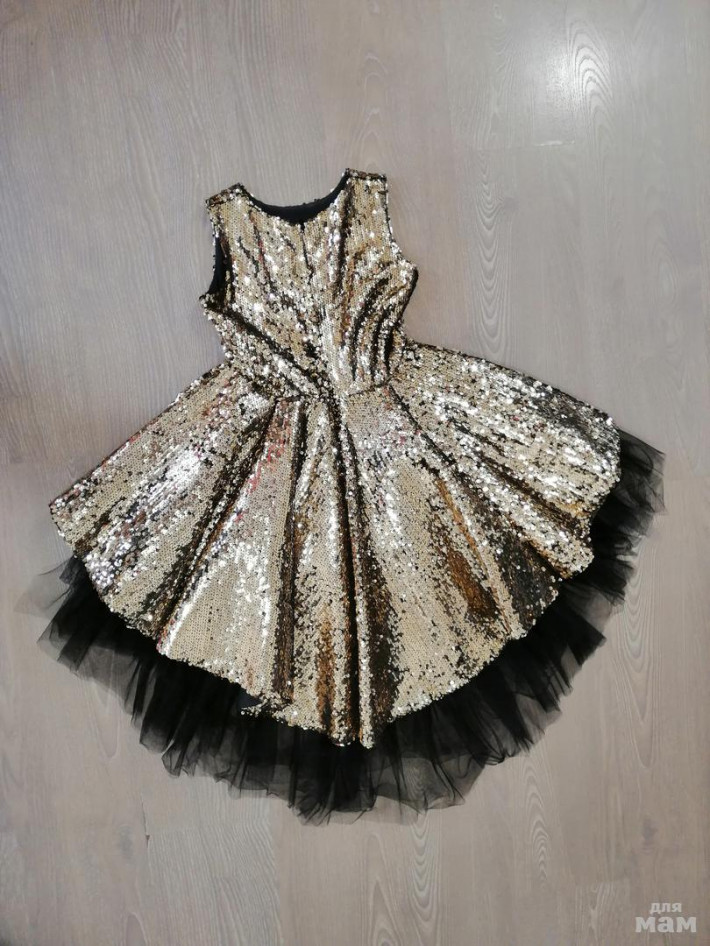 В идеальном состоянии. Самое удачное из всех платьев марки "Стильняшка". Оно просто восхитительно! Всё сверкает и переливается. Покупала на выпускной в начальной школе и ещё 2 раза на конкурсах выступили, т.е всего 3 раза было надето. Ещё бы носили с удовольствием, но мало уже(. Замеры: пог 36 см, общая длина впереди от плеча 64 см+ 16 см ярус фатина, сзади трудно замерить (шлейф) примерно 87 см в самом длинном месте + фатин 15-16 см. Платье на стройную девочку, можно носить от роста 140 до 150. Сшито прекрасно! Внутри плотный чехол х/б (пайетки не колятся). Сзади молния.