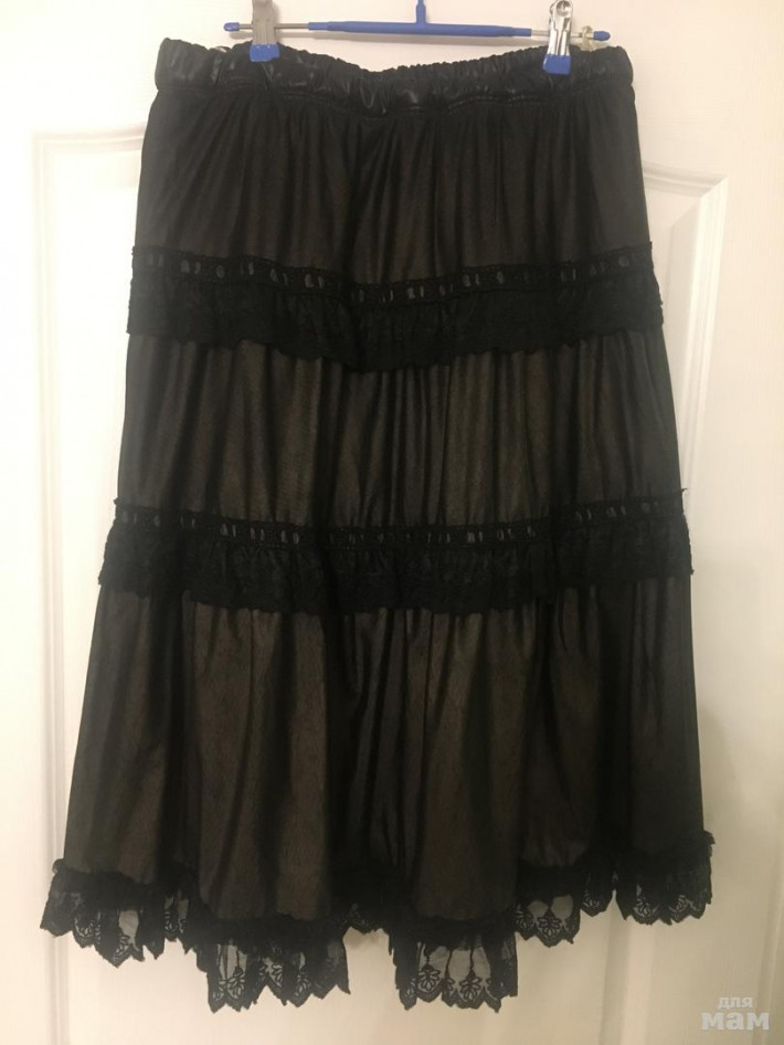 Привезли из Италии, очень красивая, качественная юбка, кружево, на подскладке, ткань как бы промасленная, но мягкая, тактильно очень приятная, цвет сложно передать, что-то между чёрным, коричневым и серым, мне мала к сожалению.