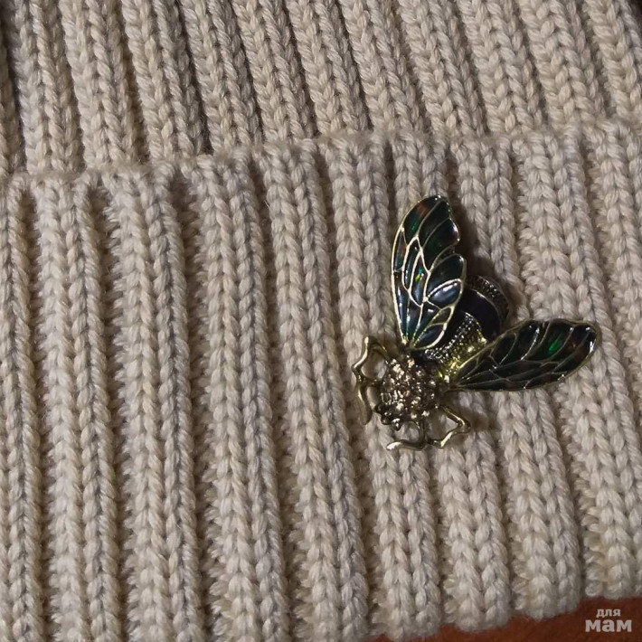 Мериносовая демисезонная шапочка с отворотом и с'емной брошью-мухой.