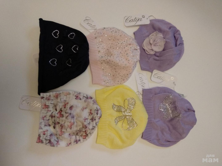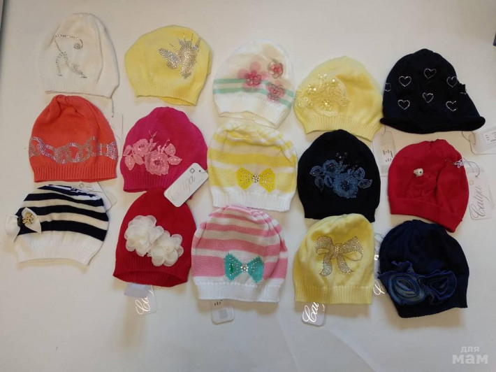 Добрый день! Шапочки синие какие есть на 52-54? И Белая с бабочкой бежевой крупной на какой объем? И белая со стразами ( полосами) на первом фото?