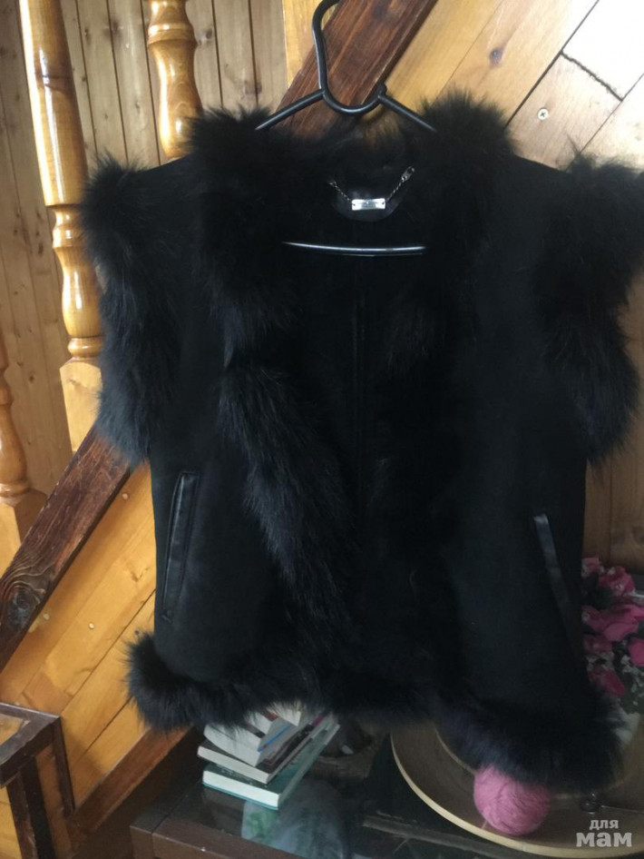 Меховой жилет, снаружи замша, внутри стриженый мех, как дубленка, только более тонкая, отделка натуральным чёрным мехом. Застегивается на металлические крючки, с боков есть карманы