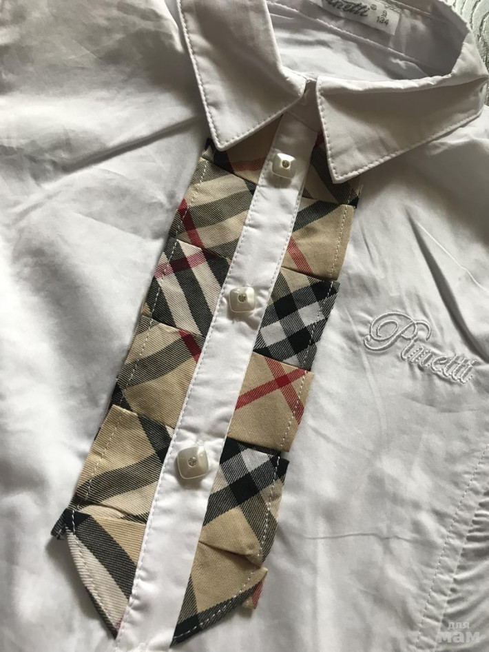 2. Блузка Pinetti, белая с клетчатыми вставками на жабо. Цена 1000 руб.