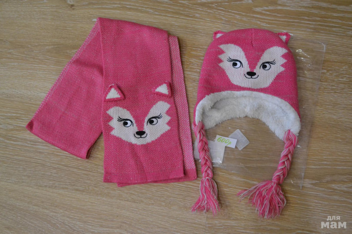 Комплект: шарфик и шапка Acoola. Шарфик большой - шапочка на ог.52см. мала - лоб не закрывает, она на голову 48-50 примерно . Одевала дочка два раза комплект, из-за того, что шапочка мала дальше не может носить... Цена комплекта 500р.