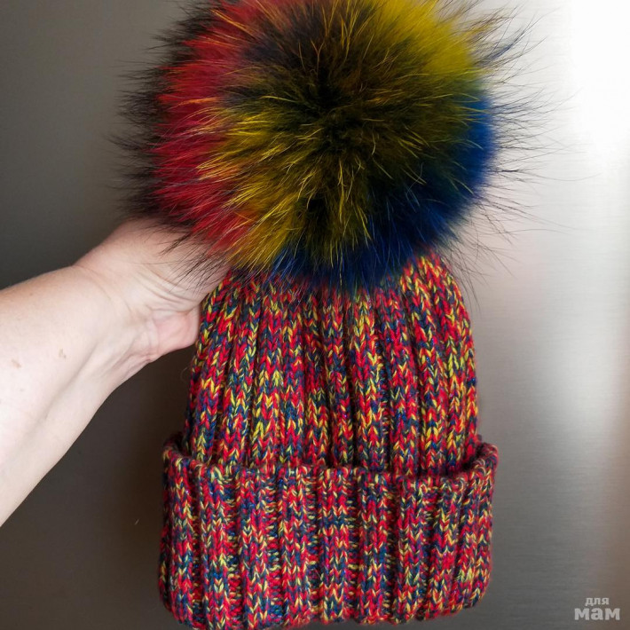 Помпон из енота мультиколор, съемный на ленточках.