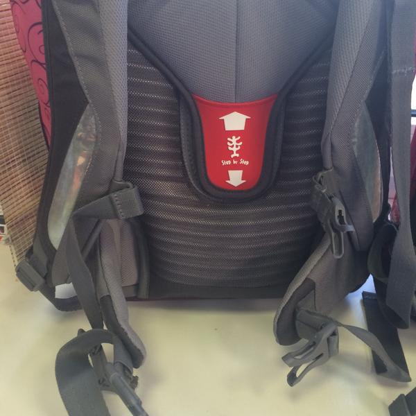 - спинка рюкзака легко регулируется под рост ребенка: U- образный клапан отделить от спинки, переместить на уровень выше или ниже под рост ребенка, зафиксировать липучку;