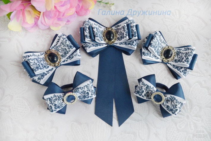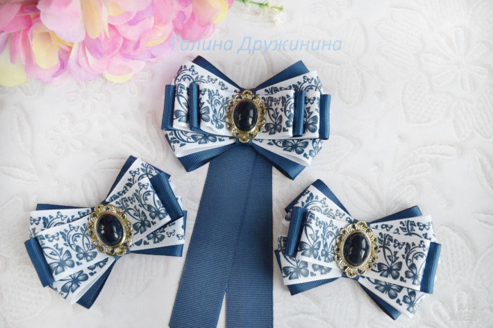 Комплект состоит из галстучка, нарядных бантиков и бантиков на каждый день, которые легко выдержат шапку)